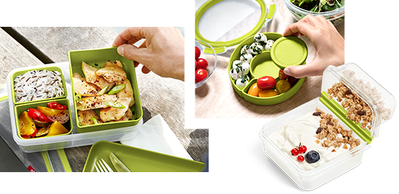 Immer mehr Mahlzeiten werden außer Haus eingenommen – bei der Arbeit, auf dem Weg in die Stadt oder auf Reisen. Das neue CLIP & GO Sortiment bietet für die beliebtesten Speisen „to go“ die richtige Lösung. Ob Salat, Joghurt, Sandwiches oder eine ganze Mahlzeit – mit praktischen Einsätzen und zusätzlichen Funktionen gibt es für jede Speise die richtige Dose. So bleibt der Salat dank separater Einsätze für Toppings und Dressing knackig frisch und das morgendliche Müsli wird mithilfe der „Knick-Ecke“ erst kurz vor dem Verzehren mit dem Joghurt vermengt. Schnell in die Tasche oder den Rucksack verstaut, halten sie 100 % dicht - keine Gefahr von Auslaufen.
