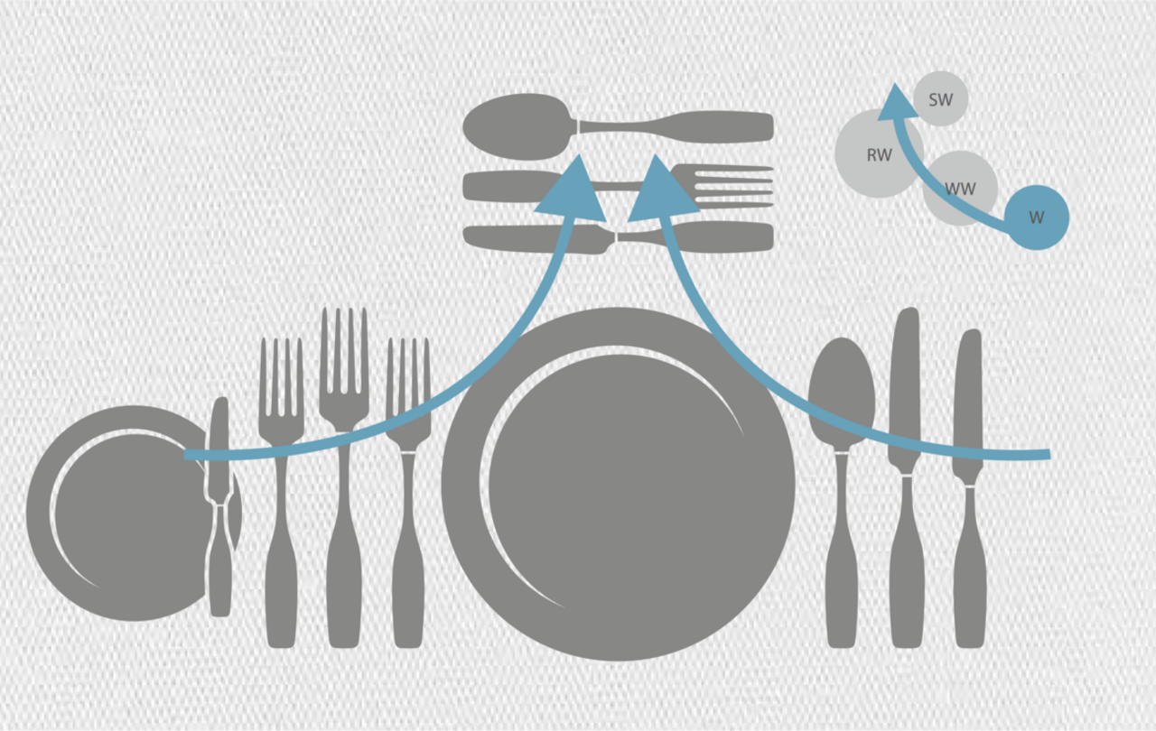 Wenn Sie sich schon immer gefragt haben, wie man die vielen Besteckteile richtig verwendet, hier eine Kurzanleitung: Einfach von außen nach innen vorarbeiten – das gilt für Besteck sowie Gläser.